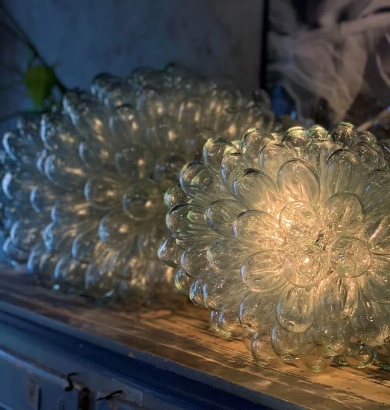 Das Glas ist handgemacht und zerbrechlich. Um Transportschäden zu vermeiden, macht der Handwerker immer mehr Blasen als notwendig. Aber auch trotz dieser zusätzlichen Sicherheitsmaßnahmen kannst du manchmal kaputte Glasblasen finden, wenn du die Lampe auspackst.