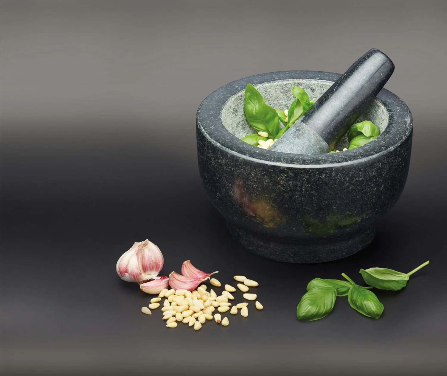 Wunderschöner Marmormörser mit Stößel, außen poliert und innen unbehandelt. Die raue Innenseite erleichtert das Mahlen von Kräutern und Gewürzen in Kombination mit dem natürlichen Gewicht des Granits.